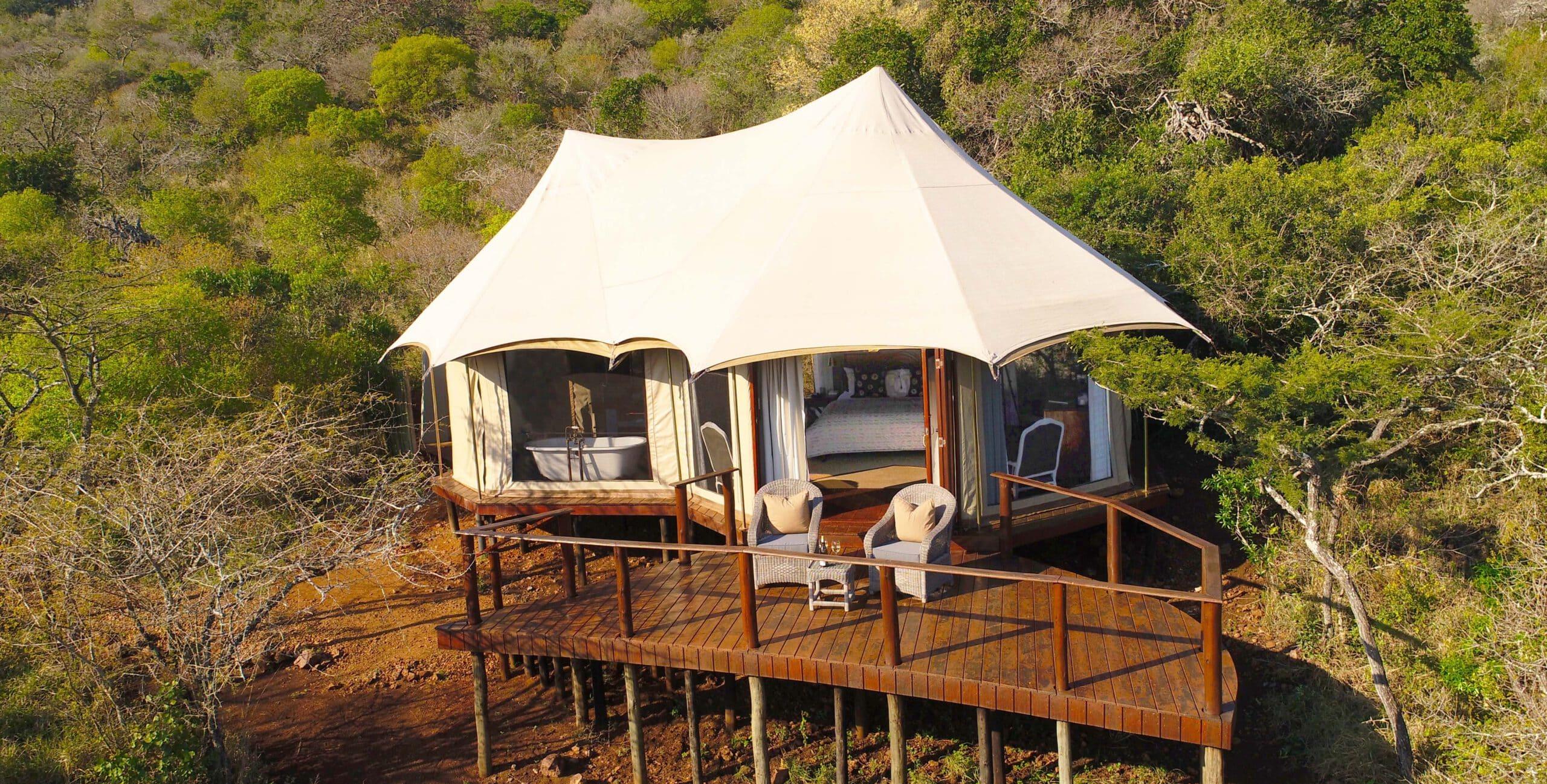 Hvert telt har en egen lounge, både innendørs og utendørs dusj, badekar, privat terrasse med basseng og vidstrakt utsikt over Msunduze-elven. Teltene kan åpnes på tre sider, noe som gir nær kontakt med naturen. Midt i campen finnes en loungedel, bar og boma (bålpanne).